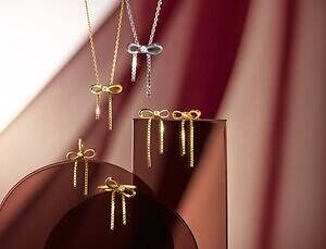 リボンモチーフが印象的な「INFINITY BOW」は、揺れるチェインが動きに合わせて煌めくレディライクなジュエリー。立体的な結び目のフォルムが、華奢ながらも存在感のある印象を演出する。ネックレスやピアス、イヤーカフなど、多彩なラインナップで、クリスマスシーズンの装いに華を添える。
