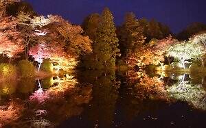 また、なからぎの森の池もライトアップ。多彩な紅葉樹の織りなす赤・オレンジ・黄・緑の鮮やかなグラデーションが水面に映り込み、幻想的な“逆さ紅葉”も目にすることができる。