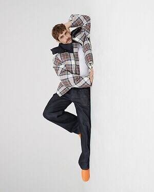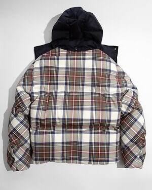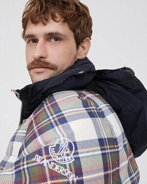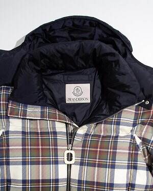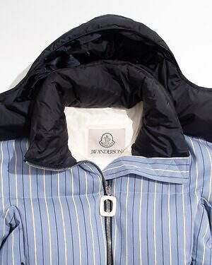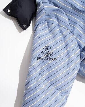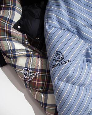 メンズダウン・ウィメンズダウンともに、JW アンダーソンらしい遊び心を加えた、クラシックシャツを彷彿とさせるデザインが魅力。表地の素材にはコットンギャバジンを使用し、メンズはマルチカラーのチェック柄、ウィメンズはブルーとホワイトのストライプ柄で仕上げた。