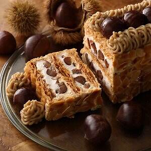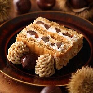 香ばしく焼き上げたサクサク食感のパイに、口どけなめらかなシャンティー、カスタードクリームと生クリームを合わせたキハチ特製のディプロマットクリームを挟んだ。ごろっとした栗の渋皮煮とコク深いマロンクリームをトッピングすることで、多彩な食感と味わいを楽しめる1品に仕上げている。