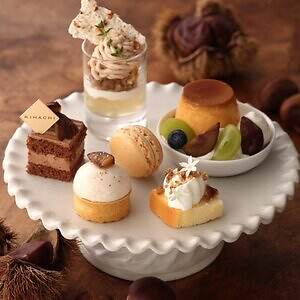 渋皮栗のショコラショートケーキ、マロンムースタルト、モンブランパフェ、プリン・ア・ラ・モード、甘栗を添えたチーズケーキ、バニラマカロン、マロンと洋梨のクレープ、マロンクラムパイ、渋皮栗とマロンジュレをのせた杏仁のブランマンジェ、渋皮栗のアイス