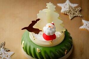 「ピスタッシュ」は、ピスタチオを主役に、ブラッドオレンジやワインガナッシュ、チョコレートの香りが重なり合う1品。クリスマスツリーをバックに、サンタクロースやトナカイが佇む、クリスマスの一幕を思わせるデコレーションがポイントだ。
