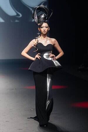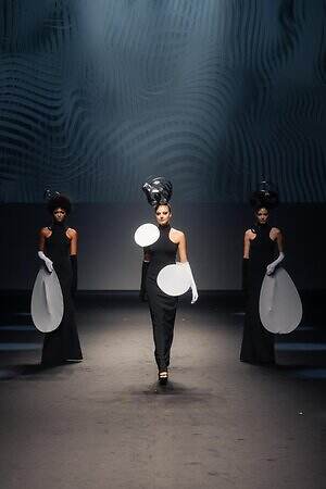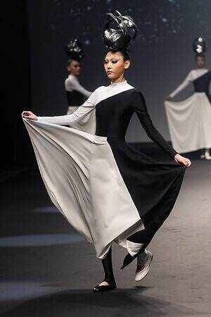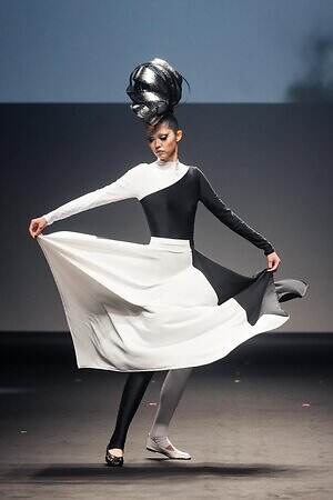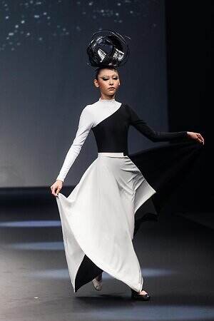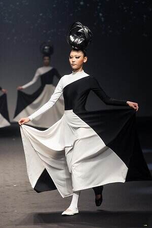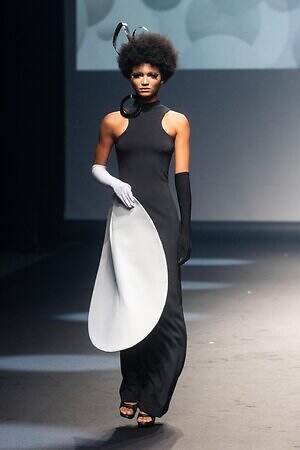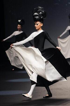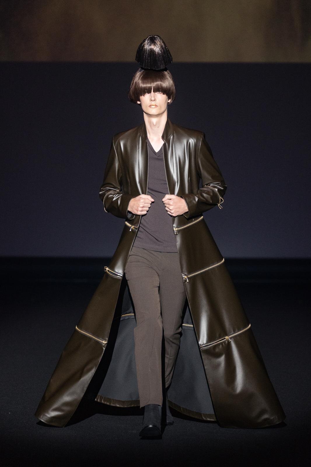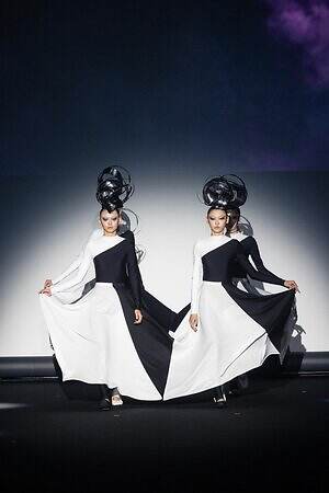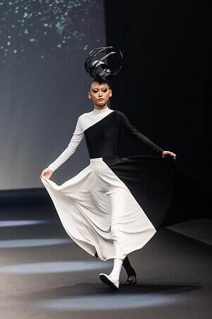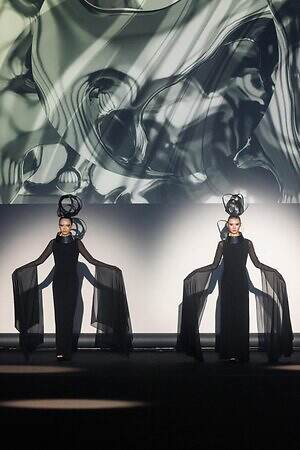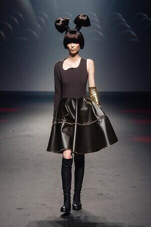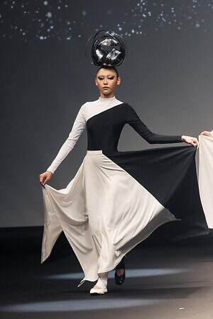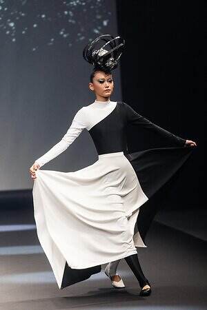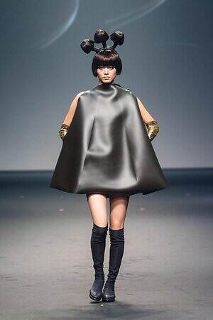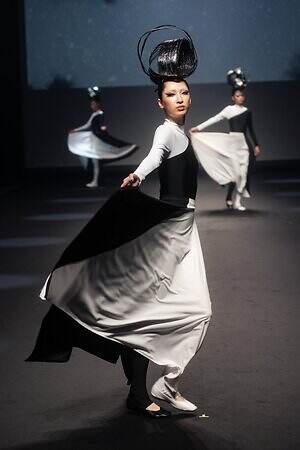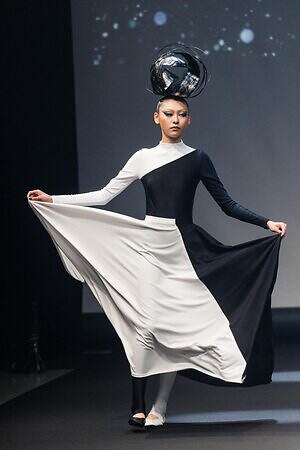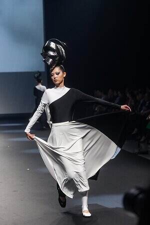 なお、イベントの前半では、ジュンコ コシノの最新コレクションが登場。タイトなフォルムと構築的なフォルムを組み合わせた近未来的なシルエットと、陰と陽を描くような切り返しデザインが印象的なウェアが次々と披露された。