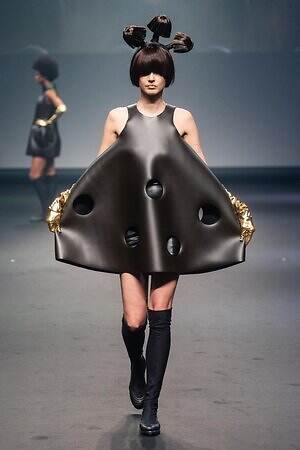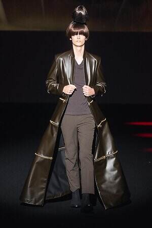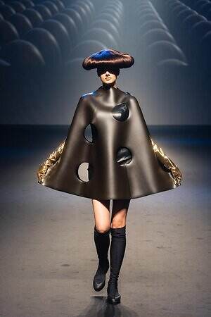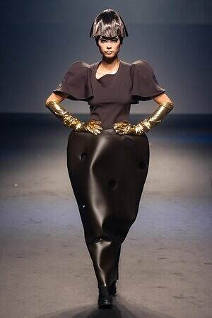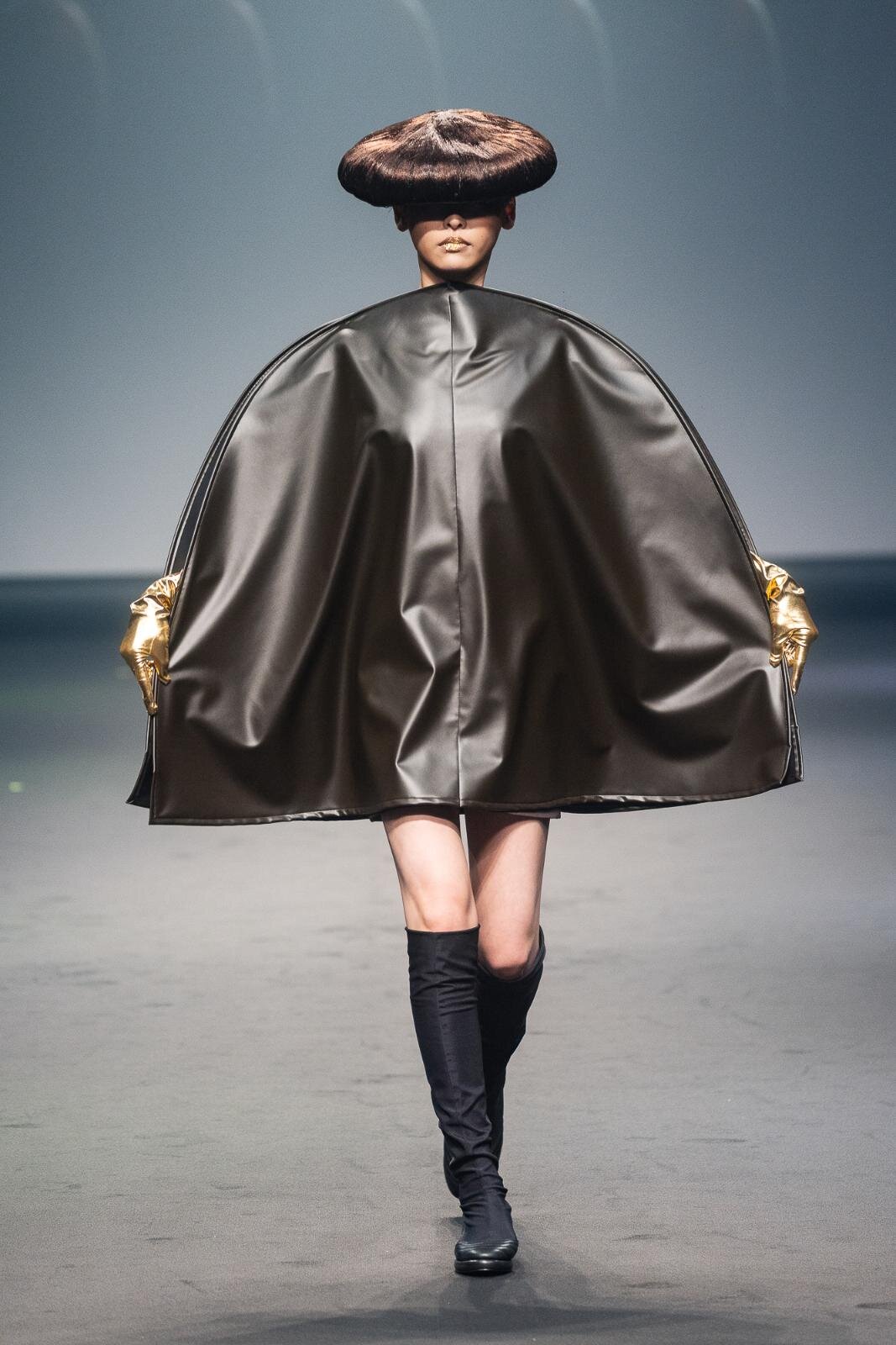 目を引くのは、丸みを立体的に表現したフォルム。ボディ全体できのこのフォルムを表現した半円状のワンピースや、ウエスト部分から足首に掛けてVラインを描くスカートなど、大胆で構築的な設計はジュンコ コシノならでは。袖と裾がふっくらと広がるロングベストは、アシンメトリーなデザインが特徴的だ。