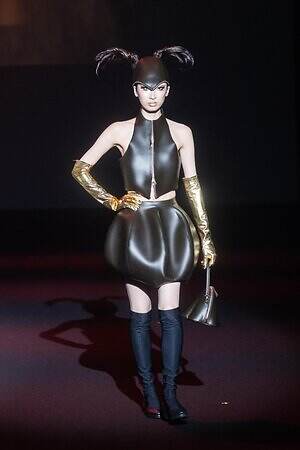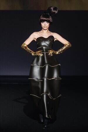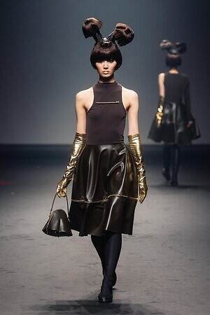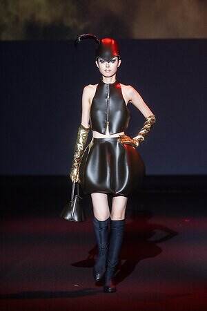 可愛らしいコレクションの中にも、メタリックゴールドを配することで、ジュンコ コシノらしいモードなエッセンスをプラス。フレアスカートにファスナーを走らせたり、ライトを受けて煌めくロンググローブを合わせたりすることで、ワントーンで統一したスタイリングを引き締めている。