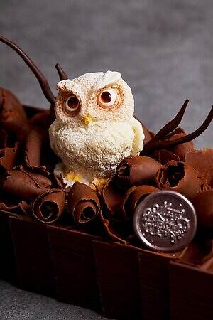 「ショコラ・ド・ノエル」は、愛らしい白ふくろうがキャッチーな新作ブッシュ・ド・ノエル。ほろ苦いオレンジピールがアクセントの濃厚テリーヌショコラと、‟チェリーの洋酒香る”フォレノワールのチョコレートケーキを並べ、白ふくろうが暖をとる木の葉をイメージしたジャンドゥージャを全体にあしらった。
