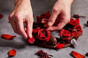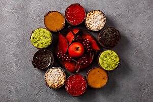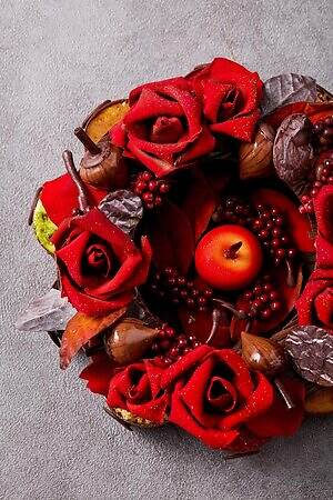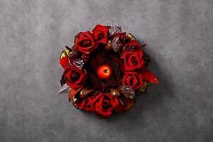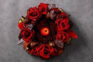 中でも注目は、クリスマスリースに見立てた新作「クロンヌ・ド・ノエル」。‟芳醇なバター香る”アーモンドサブレ「スタンゲン」をベースに、真っ赤なバラ・りんご・赤すぐり・どんぐりなどの華やかなチョコレート細工を飾り、本物さながらのビジュアルに仕上げた。リースの下には、キャンドル風のケーキ5種が10個隠れており、家族や友人など大人数でシェアして食べられるのが嬉しい。