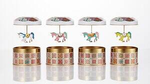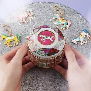 お菓子缶を開けると、中からメリーゴーランドのようにユニコーンチャームが登場。チャームは全4種類を用意しており、どれが入っているかは缶を開けるまでのお楽しみだ。