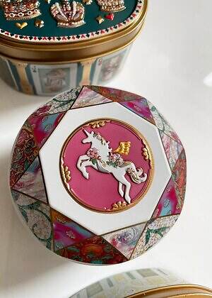 「ユニコーン缶」は、ミニチュアタイルとユニコーンをモチーフにした“レトロ可愛い”お菓子缶。蓋面には、色とりどりの花をまとったユニコーンの姿をガラス絵でオン。その周りに、ユニコーンが飛んでいく虹色の空や、ユニコーンの蹄の音が響く夢のお城のタイルなどを配置している。