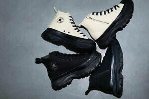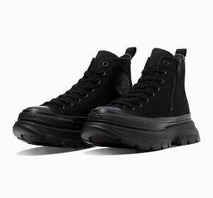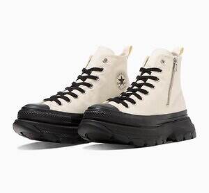 トレッキングシューズをモチーフにした厚底スニーカー「オールスター トレックウエーブ Z HI」は、サイドにジッパーを加えて履きやすさをプラス。凹凸があり滑りにくいデザインのアウトソールや、厚みのあるE.V.A.ミッドソールを搭載しており、歩きやすい機能性も備えている。カラーはオールブラックモデルと、白黒のコントラストが効いたオフホワイトアッパーのモデルを揃える。