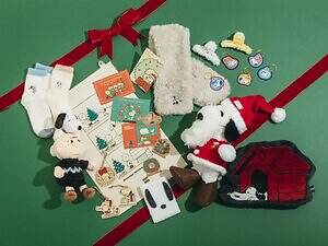 ミュージアムショップ「ブラウンズ ストア(BROWN’S STORE)」には、クリスマスシーズンならではのグッズが目白押し。スヌーピーのぬいぐるみに着せて楽しめる、サンタクロースコスチューム4点セットや、クリスマスアートのダイカットステッカーなどの雑貨が揃う。また、スヌーピーの耳と鼻が愛らしいもこもこミラーや、ファーマフラー、ブランケット入りクッションなど、あたたかな質感に仕上げた冬にぴったりのグッズが店頭に並ぶ。