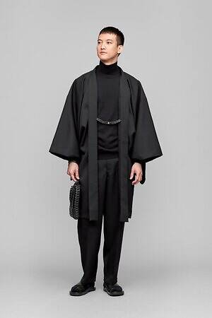 2019年から継続的にコラボレーションコレクションを発表しているY. & SONSとグラフペーパー。2025年の秋冬では、グラフペーパーの生地を取り入れたきものと羽織、パンツのセットアップに加え、きものの上から着用できるコートなど、日常の中に取り入れやすい快適な着心地のアイテムを展開する。