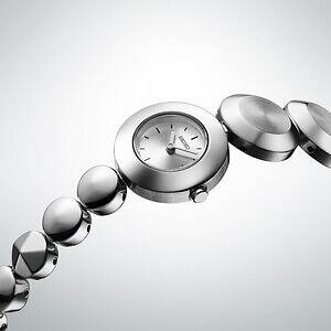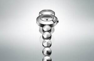 新作のブレスレットウオッチは、小ぶりなサイズ感やゆったりとした着け心地を踏襲しつつ、現代的にアップデート。当時は婦人用として発売されたオリジナルモデルを、ジェンダーレスに使える新たなウオッチへと生まれ変わらせた。円形のパーツをアシンメトリーに連ねた、スタイリッシュなデザインに仕上げている。