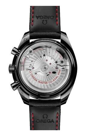 手巻きムーブメントを採用した「ブラック エディション」は、マット仕上げのブラックダイアルに鮮烈なレッドのセンタークロノグラフ針を配した腕時計。オメガのロゴやインデックス、コーアクシャル マスター クロノメーターのロゴはグレーであしらい、「スピードマスター」のロゴはレッドで印象的に配置している。