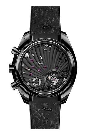 コーアクシャル マスター クロノメーター キャリバー3869を搭載したムーブメントにはレーザー加工を施し、月面の質感を表現した。透かしのあるスケルトン仕上げのグレーダイアルからは月の“表側”が、ケースバック越しには月の“裏側”が見えるようになっており、まるで乗組員たちが宇宙から月を見つめていた時の光景を再現するかのようなデザインに仕上げている。