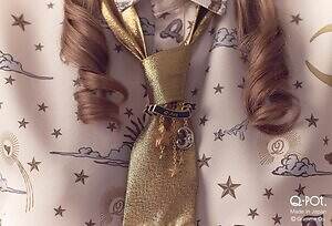 注目は、ゴージャスなリボンバレッタ。夜空のような深いネイビーのベルベットに、金色に輝く三日月や星、そして大粒のパールを散りばめている。髪飾りにしたり、襟元にリボンタイ風に添えたりと、多彩な使い方ができるのも魅力だ。