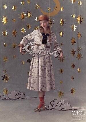 さらに、アパレルラインのキューポットドレス(Q-pot. Dress)では、コレクションテーマを反映したウェアが登場。月や星、太陽、雲、そして“クロワッサン”の文字が描かれたフラッグ風ロゴなどが散りばめられた、子供部屋の壁紙のようなムードのテキスタイルを用いている。