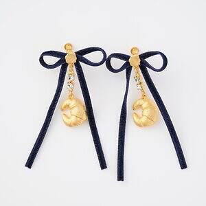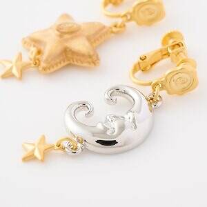 イヤリングは、三日月型のクロワッサンがアクセントに。華奢なベルベットリボンの下に、煌めくクリスタルガラス、そして金色のクロワッサンを連ねている。動くたびゆらゆらと揺れて煌めき、顔周りを華やかに彩ってくれる。