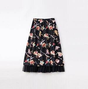 「ザ トイボックス ドレススカート」は、裾まわりをチュールで切り替えた華やかなデザイン。軽やかな透け感が動きに合わせて揺れ、上品な甘さを添える。ふんわりと広がるシルエットがクラシカルな印象を引き立てる一着だ。