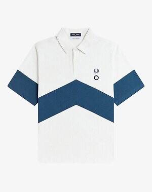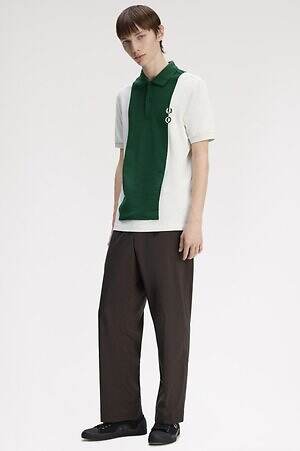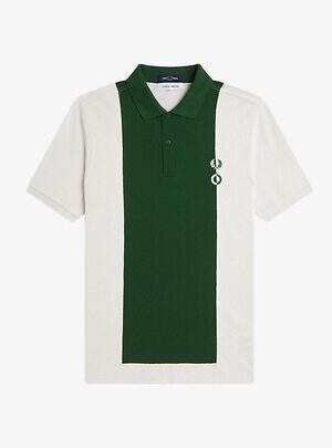 中でも注目は、フレッドペリーの定番ポロシャツをベースにした、グリーンとホワイトのツートンカラーシャツ。切りっぱなしのグリーンパネルをフロントからバックにかけて配し、モダンな佇まいに仕上げている。2色で表現したフレッドペリーの“ローレルリース”ロゴと、クレイグ グリーンのサークルロゴも目を引く。
