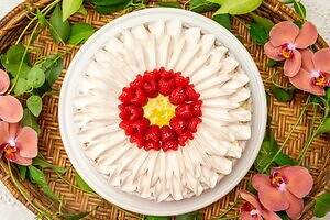 サクサク食感のタルト生地に、くちどけなめらかなチョコレートクリームと爽やかな酸味のレモンクリームを重ね、仕上げにブラッドオレンジ風味のメレンゲ、甘酸っぱいフランボワーズをトッピング。“愛情”や“希望”といった花言葉のあるガーベラのタルトで、大切な人へ感謝の気持ちを伝えてみては。