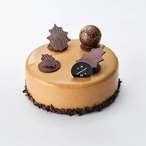 「ノエル ドゥ ピエール 2025」は、艶やかなキャラメル色のグラサージュが目を引くクリスマスケーキ。トップにビターチョコレートのボールとヒイラギを飾り、シックな輝きを添えた。キャラメルを主役に、くちどけのよいババロワキャラメルと濃厚なクレムーキャラメルを重ねた2層仕立てとなっている。甘さと苦みのバランスが際立つ奥行きのある味わいだ。
