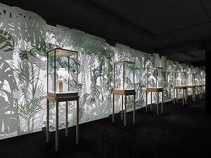 “野性的な動物”と意味する「ワイルド ファウナ」と題した空間では、「パンテール」のみならず、さまざまな動物たちをモチーフにしたカルティエのジュエリーを展示する。時に写実的、またある時は抽象的に表現されるジュエリーの数々は、思わず時を忘れて見とれるほどに美しい。