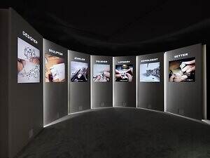 「パンテール」のデザインとクリエーションを体験できるエリアも展開。「パンテール」のクリエーションを形成する“ナチュラリスト”、“グラフィック”、“アブストラクト” という3つのデザインコードのもと製作された作品を展示する。また、「パンテール」が実際に完成するまで、デザイナー、彫刻職人、ジュエリー職人、研磨職人ら様々な職人たちの手を経てハイジュエリーへと昇華させる軌跡も紹介する。