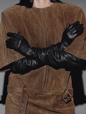 1937年創業のフランスのグローブメーカー・アニェルとのコラボレーションでは、肘上まで伸びるオペラグローブを大胆にアレンジしたグローブを展開。柔らかなナッパレザーを採用したしなやかなロンググローブや、腕の真ん中でカットしたショート丈のグローブが揃う。