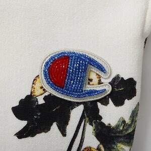 クルーネックスウェットやフーディー、スウェットパンツには、外に飛び出したタグ、湾曲させた縫い目、左右でアシンメトリーな丈など、ユニークなディテールをオン。チャンピオンを象徴するロゴは、煌びやかなビーズワッペンで再現しているのもポイントだ。