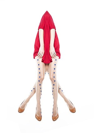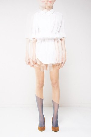 その一方で、シックな魅力を持つのが「ペインティング」シリーズ。上半分だけ、下半分だけなど部分的に彩色されたストッキングは、コウヘン編みという編み方を用いることで、独自の透け感を出した。プリントは直線的でエッジィなデザインなので、シンプルにあわせるだけでぐっとモードな印象になる。