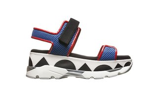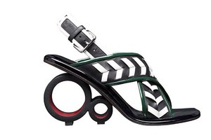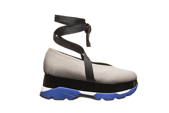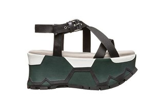 シューズのキーワードは厚底。マルニらしい深いグリーンと爽やかなブルーをポイントにした、スポーツテイストあふれるサンダルが揃う。柔らかな素材が足の甲を包み込む、ブラックのリボンをあしらったシューズは、バレエシューズとサンダルを組み合わせたような斬新なデザイン。ミドルソールのエナメル部分の中は、ABS樹脂を使用。また特徴的なヒールのシューズは、ミラノのインダストリアルデザイナーである、ジョーコロンボの作品よりインスパイアされたもの。円の中のそれぞれのカラーにも注目だ。シューズの垣根を越え、まるで芸術作品のようだ。