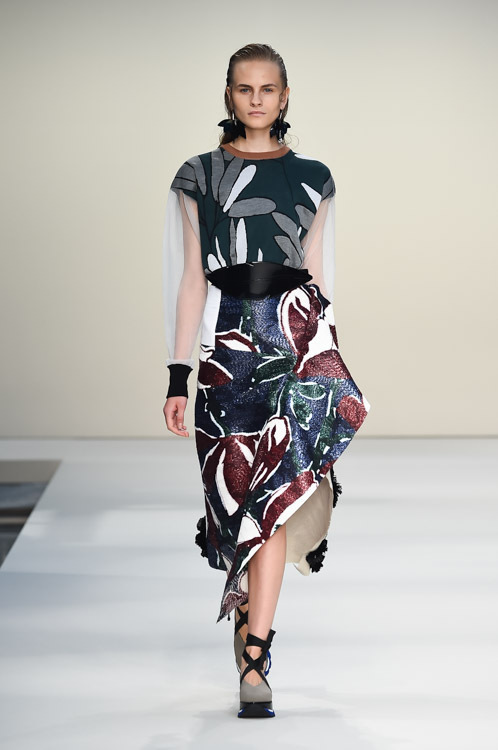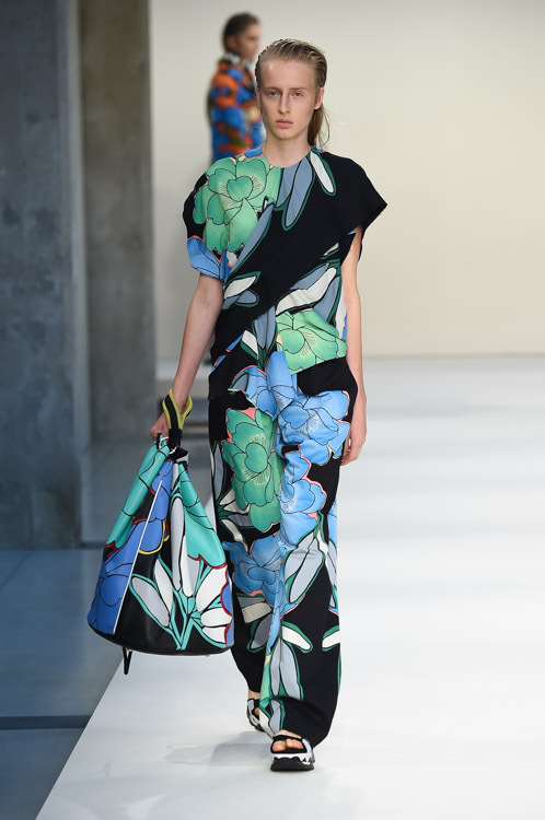 マルニ(MARNI)の2015年春夏コレクションのテーマは、“クレッシェンド”。ショーの進行と共にルックが強調されていった。オーガニックな雰囲気のルックから重ね付けした、刺繍やラフィアのアップリケなどの繊細な装飾を施したルックまで、多彩な装いが展開された。中でも鮮やかなイエロー、グリーン、ブルーのパレットで表現された小物たちが目を引く。