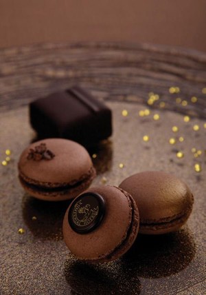マカロンは、全3種。「ブラン」は、ミントの葉を混ぜ込んだホワイトチョコレートのガナッシュクリームと苺のコンフィチュールを合わせたオリジナルのフレーバー。ミルクチョコレートガナッシュに、キャラメリゼしたヘーゼルナッツとコーヒー風味のキャラメルソースをあわせた「ラクテ」と、ビターチョコレートガナッシュにマルムラードオレンジを組み合わせた「ノアール」も展開される。