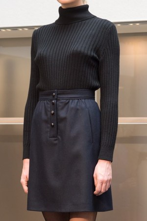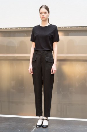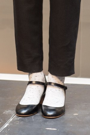 グレーの霜降りデザインが目立ったパートは、フランスの映画監督であるマルグリット・デュラスの作品「Vera Baxter」からインスパイア。そして最後には、彼流のセクシーだという、ブラックのレーストップスを、ハイウエストのスカートやパンツにインしたコーディネートが現れた。足元を飾るのは、ヒールが低めのストラップシューズ。単にマニッシュというだけではなく、個性を際立たせるためのデザイン。彼の哲学は、今季も変わることなく、コレクションに流れていた。