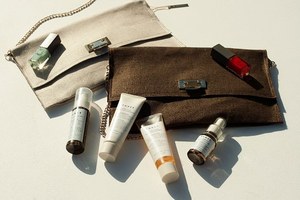 バカンスで活躍しそうなクラッチバッグに、THREEの人気コスメを詰め込んだ。人気の「ネイルポリッシュ」からは、レディライクな指先を叶える「クリアレッド」と風に泳ぐ雲をイメージした「ミントカラー」をセレクト。更に、快適な使い心地となめらかな仕上がりを実現した、ヘアケア・ボディケアも付属する。