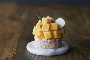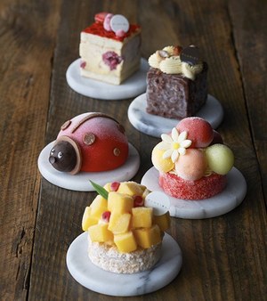 マンゴーや木苺などのフルーツをボール状シャーベットにしたものを乗せた「バルーンドフリュイ」や、南国感たっぷりの「マンゴーパッション」、定番アントルメグラッセ「ダコワーズ」など、5種類が1セットになっている。
