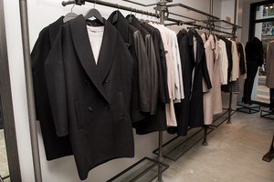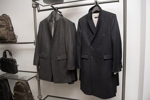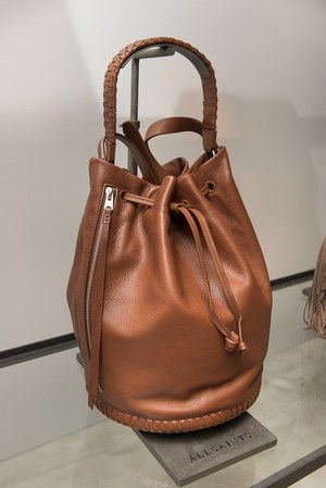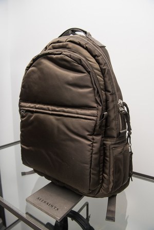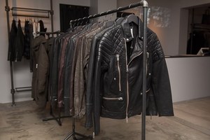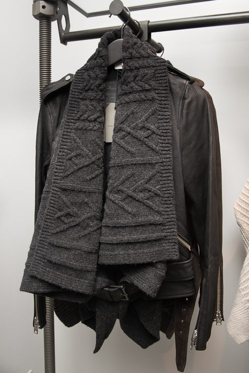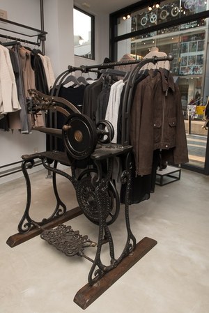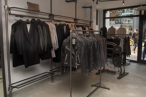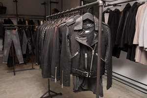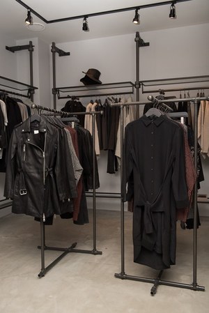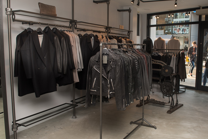 店内はアンティークミシンや、インダストリアルな鉄の什器などが並び、心地よく響く音楽や壁に映し出されたイメージ映像と共に「オールセインツ」の世界観を感じることができる。毎月新商品が展開され、オンタイムで着られるアイテムが揃うのが特徴。店内ではシグネチャーアイテムであるバイカージャケット、レザーアイテムを中心に、メンズとレディースをバランスよく販売する。シューズやバッグまで豊富に並ぶ。