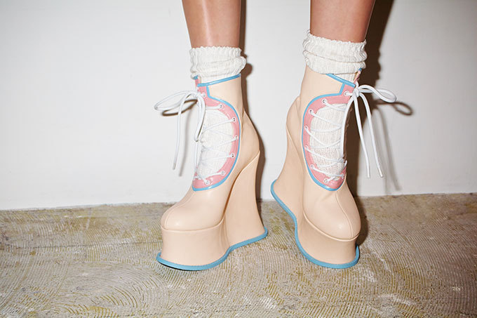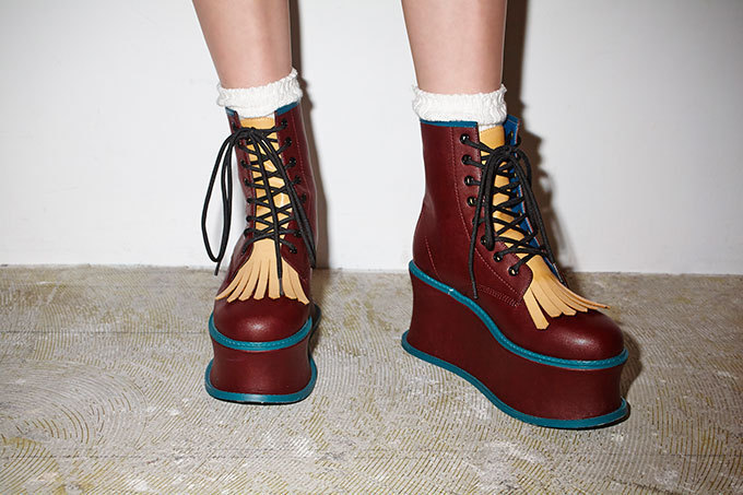2015年秋コレクションより登場したプラットフォームシューズは、フリンジやレースをあしらいアップデート。地面に吸い付くようなシルエットのソールが特徴だ。