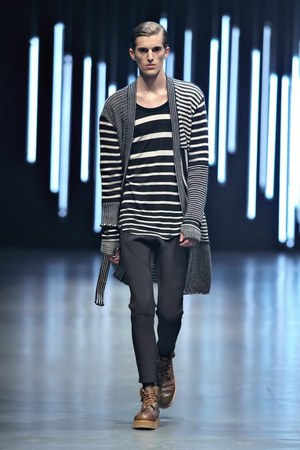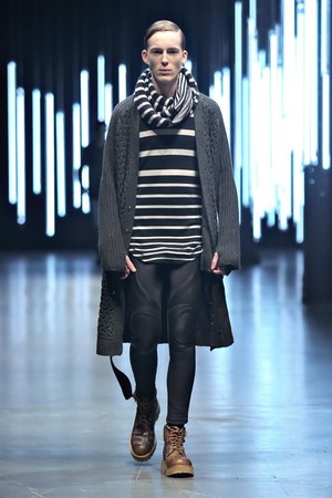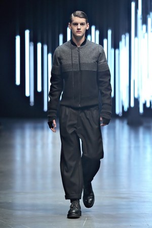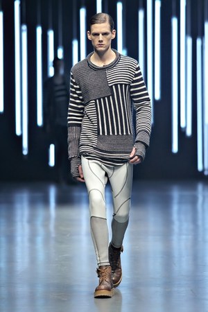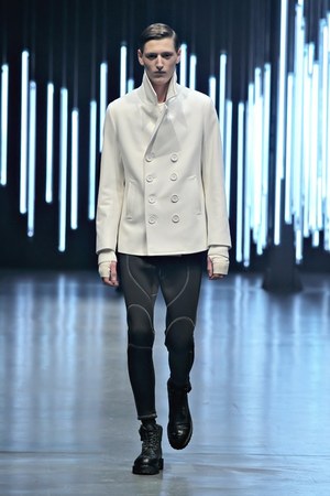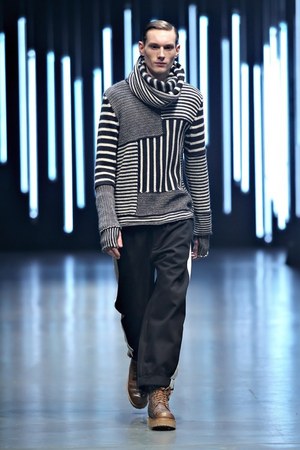 メインはマリンスタイルで、ピーコートのシルエットはクラシックだが、素材はなんとネオプレン(合成ゴム)。そのマットな質感と独特なシルエットがユニークな雰囲気を作り出している。ネオプレンのパンツはまるでウェットスーツのようで、そこにフィッシャーマン風のニット合わせるというアンバランスを狙ったスタイリングが新鮮。スーツスタイルのボトムスも白いラインが爽やかなセーラーパンツ風のトラウザー。異素材の組み合わせではっきりとしたカラーブロックが楽しいジャケットや、グラフィカルなパッチワークのマリンストライプのニットがモダンな雰囲気を漂わせながら、モノトーンでシックなマリンを提案した。