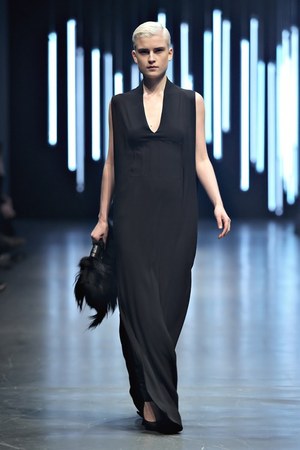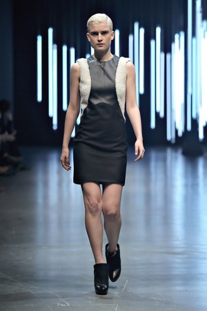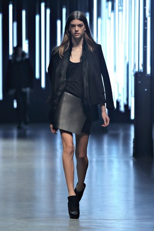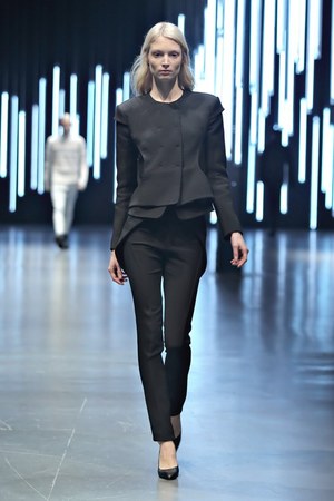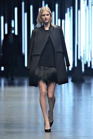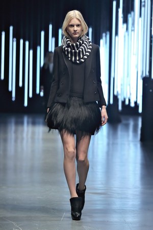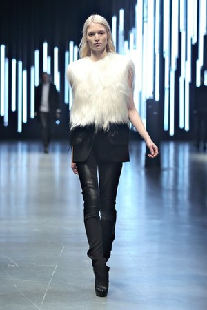 レディースのコレクションにもネオプレンを使用し、構築的なジャケットとシガレットパンツのコーディネートは、黒一色で上品にまとめられた。マットなコートの下からのぞく黒のファースカートや、真っ白なファーのベストが、スポーティーな印象のネオプレンのアイテム達をグラマラスなスタイルへと昇華させた。