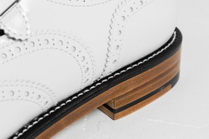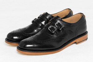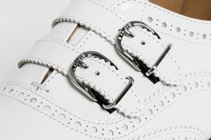 新作「ダブルストラップシューズ」は、紳士靴のディテールを落とし込んだアイテム。通常紳士靴で使用される“グッドイヤーウェルト式製法”で完成させた、重厚感のあるソールは、マニッシュな雰囲気を香らせる。なめらかな光沢のあるアッパー部分には、別色が顔をのぞかせる穴飾り(ブローグ)をあしらい、2本のストラップを添えて、遊び心あふれるデザインに。