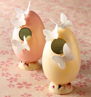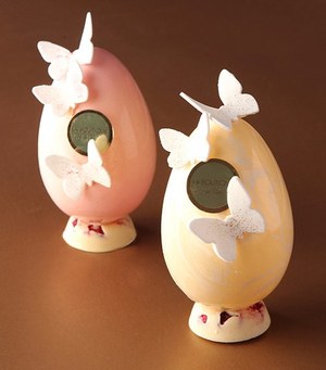 卵型にかたどったホワイトチョコレートをパールホワイトとベビーピンクに色づけ。中にはそれぞれバニラ、フランボワーズの口どけなめらかなキャラメルが3個入っている。