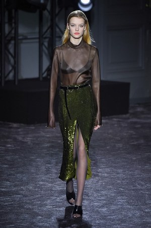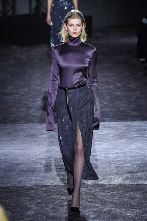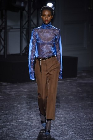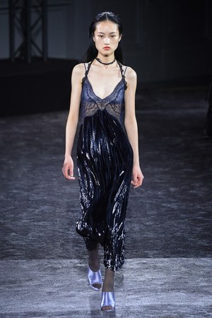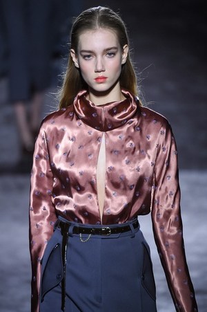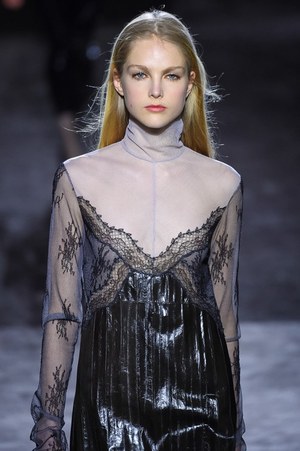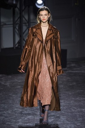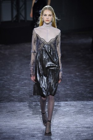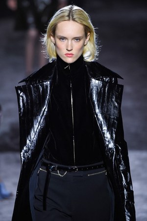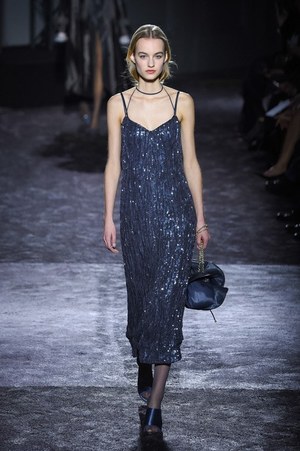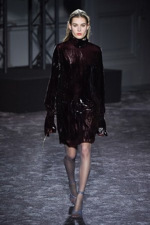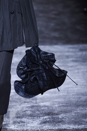 異なるテクスチャーのミックスは、今季も継続。濡れたようなツヤ、キラキラとした輝き、グローな質感の融合が、そこはかとなく優美な気品を生んでいる。