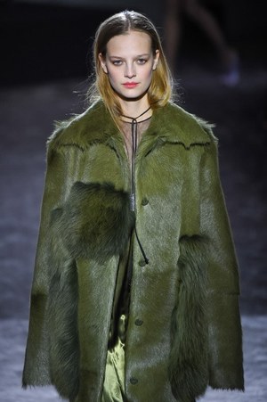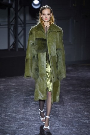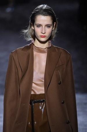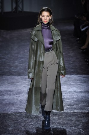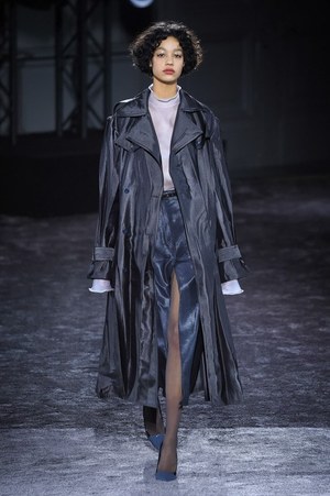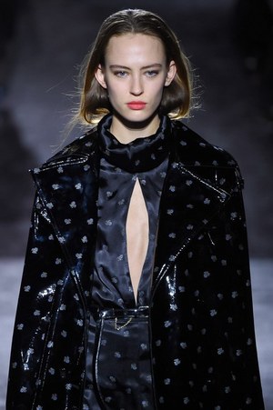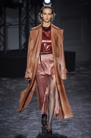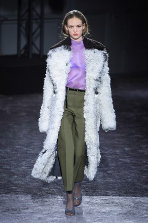 アウターは、どれも肩幅を大きくとりゆったりと。トレンチコートの袖は引っ張られたように長く、ダブルブレストコートのラペルは大きい。ファーコートはパッチワークしたようなデザインで、パテントレザーのコートにはドット柄が描かれている。