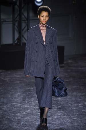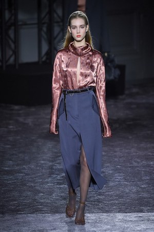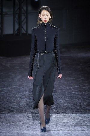 襟高ブラウスとクロップドパンツ、ジップ付きトップスとミドル丈のスカート…。ドレス中央には、裾に向かって大胆なカッティングを加え、スカートのサイドにはスリットを配している。これらの要素が飛び交い生まれた、縦長のプロポーションは、今季のキーワードの一つ。