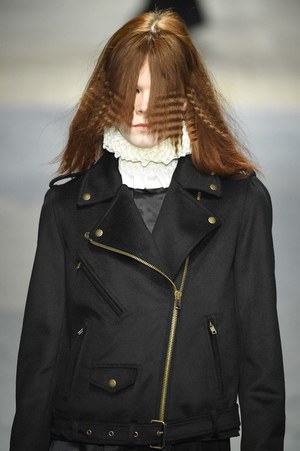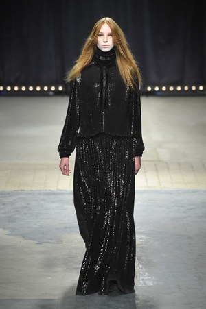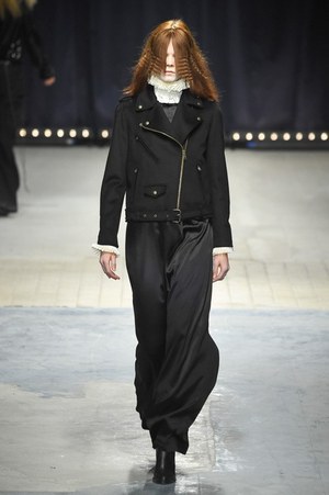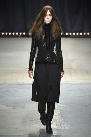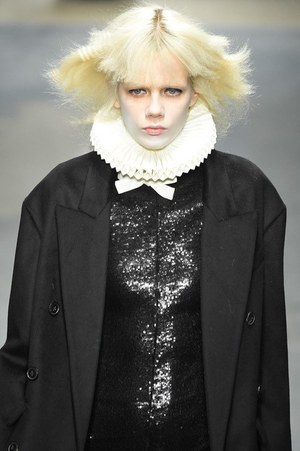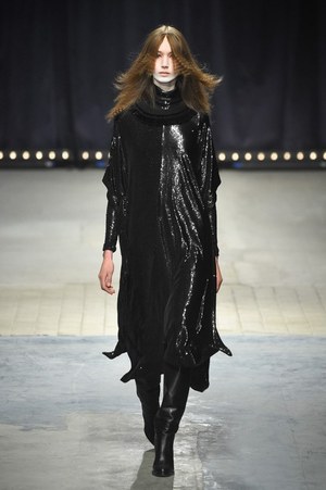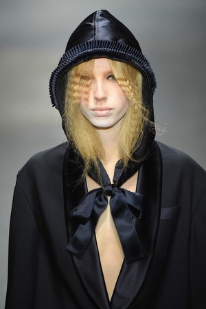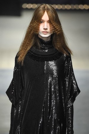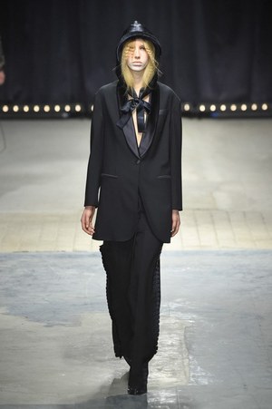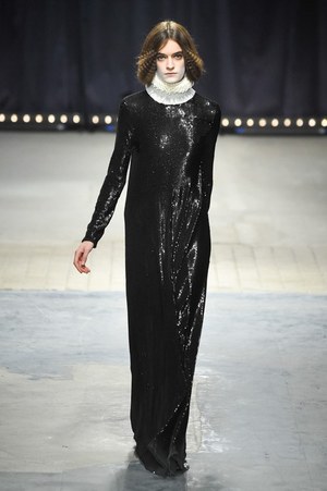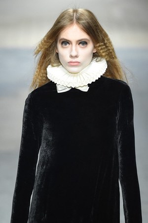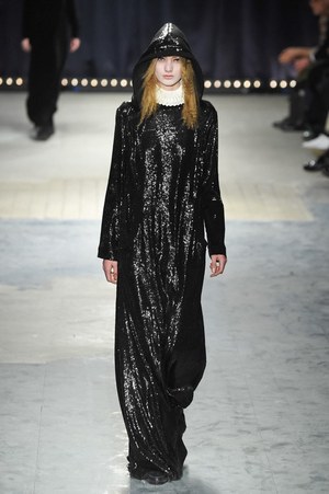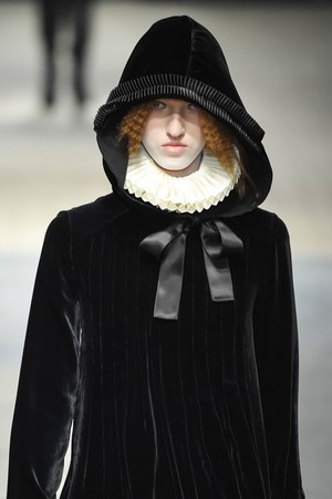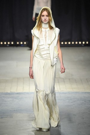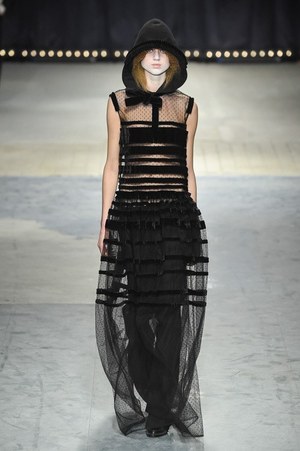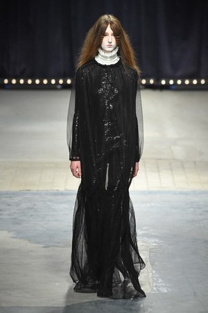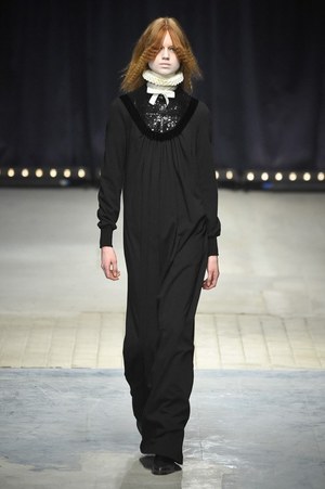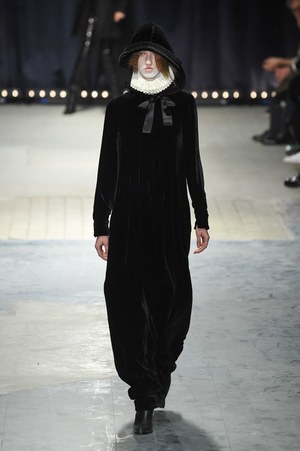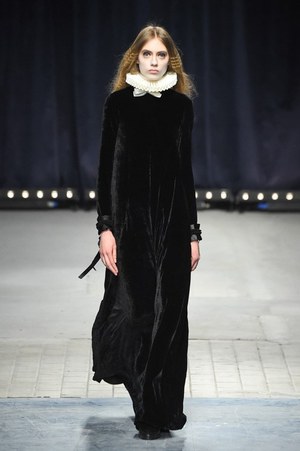 ランウェイで綴られるのは、引き続き、禁欲的でゴシックなスタイル。身体を包み込むようなロングシルエット、首元を覆い隠す紙細工のような襟元。モノトーンでまとめたスタート時は、特にこの雰囲気が強く漂っている。