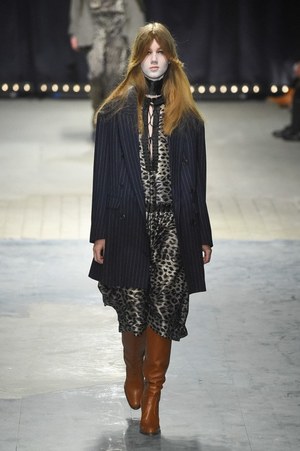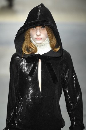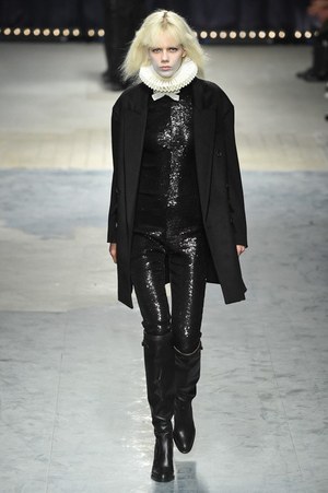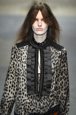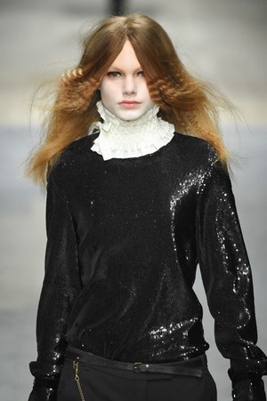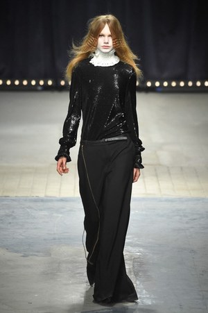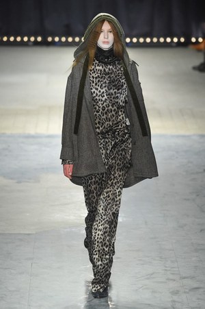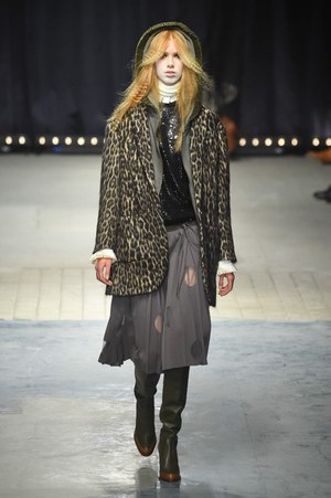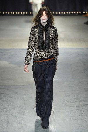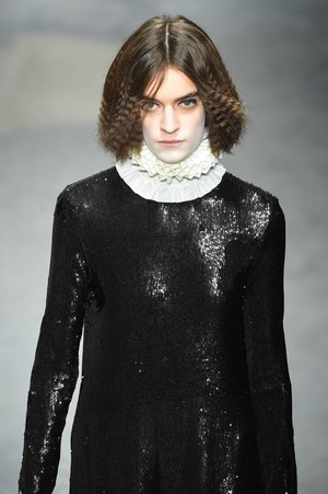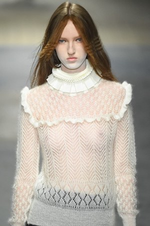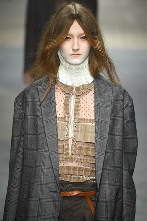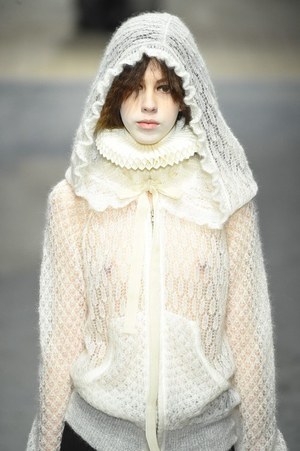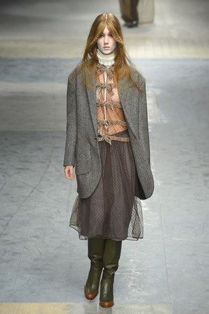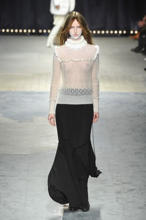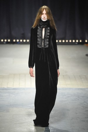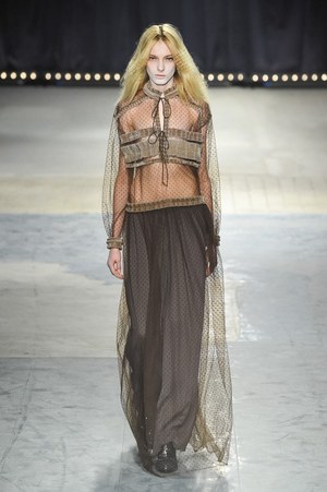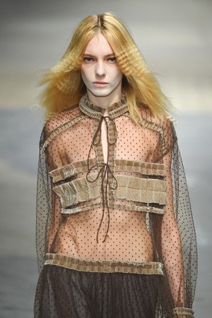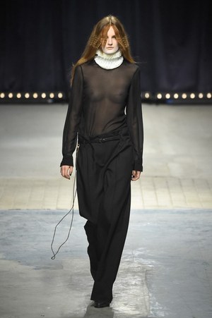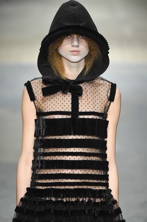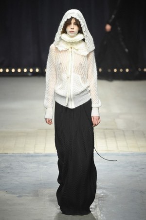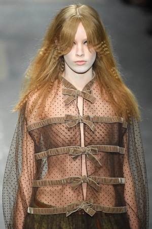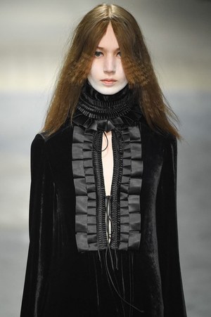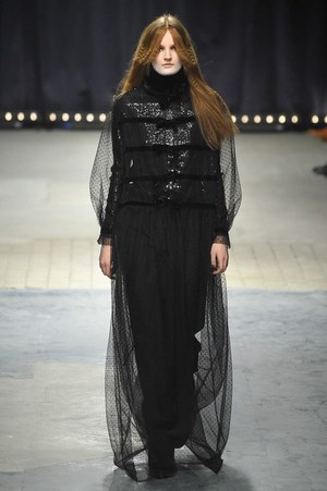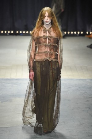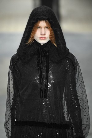 中盤以降は、時折、ロマンチックな要素をプラスする。ボディを隠し込んでいたドレスは、シースルー素材となり、パンツルックの上に重ねる“プラスオン”のアイテムへと変化。布地にはたっぷりのフリル、ベルベットのリボン、細やかなプリーツ、繊細なドット柄をのせて、フェミニンに。ホワイトのモヘアニットやファーコートを仲間に加えれば、厳かな雰囲気はどこへやら、ソフトなムードさえも流れ込む。