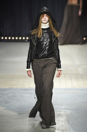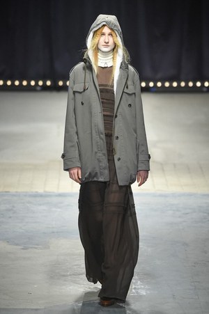 しかし、徐々にこのイメージは崩れていき、開放的な方向へと向かう。一つは、メンズライクなウェアの差し込み。ピンストライプのテーラードジャケットやワイドパンツ、加えて、ミリタリージャケットやフーディ―など、異なるテイストを掛け合わせていく。サイズはどれも大きく、アウターはドロップドショルダーで身幅はたっぷりと、パンツに至っては足が2本以上入りそうなほどに太い。