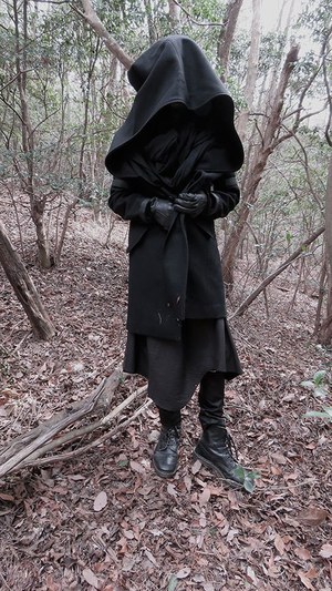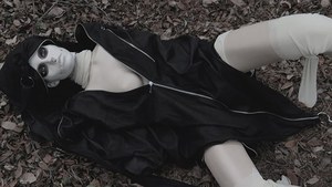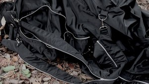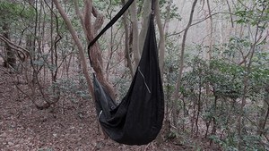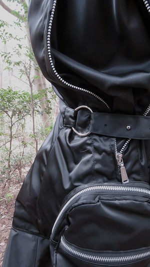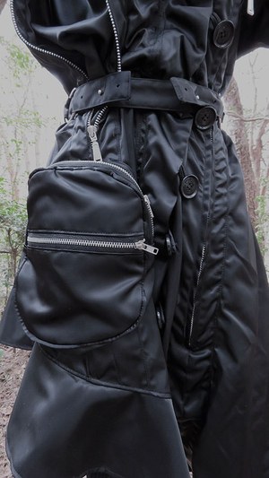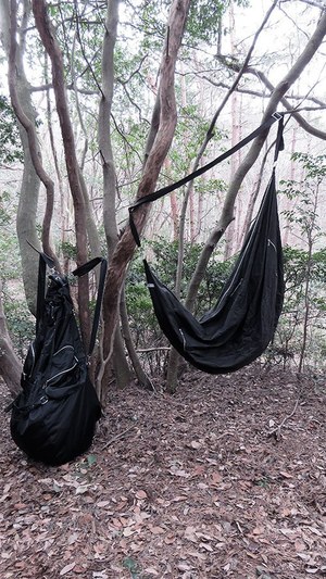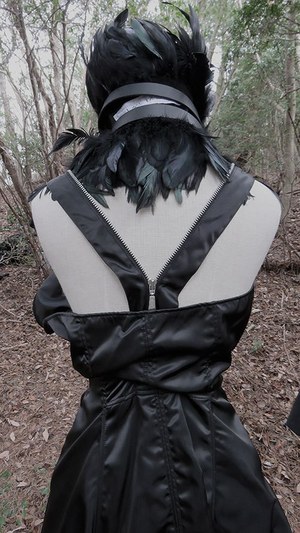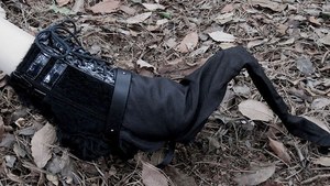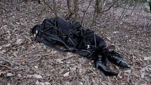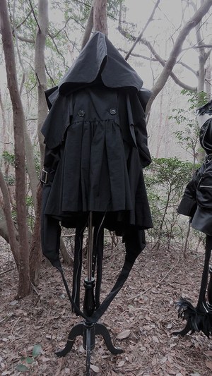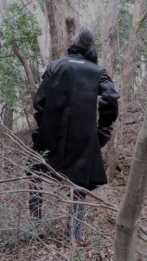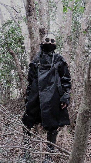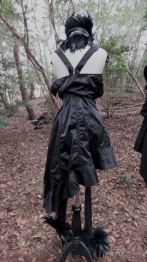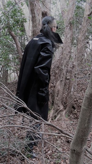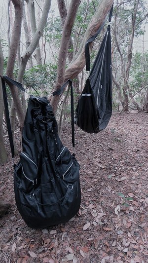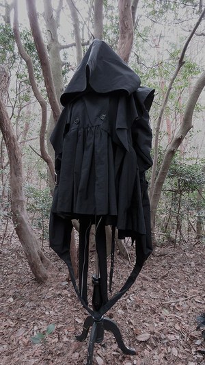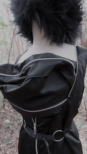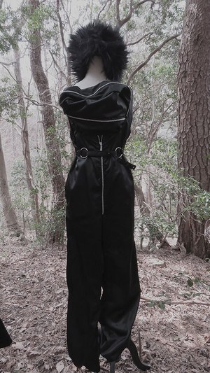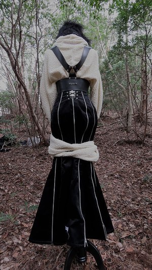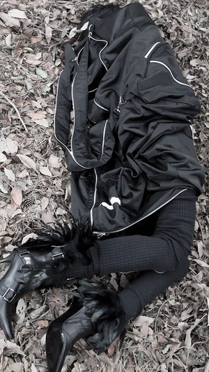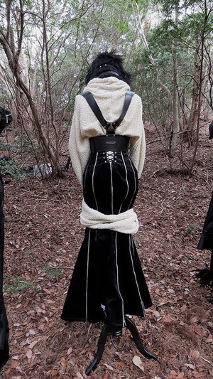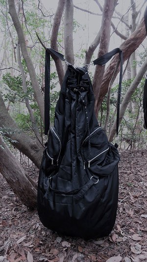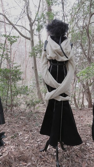 落ち葉に覆われた土地に吊り下げられたミノのような黒いバッグ。その弛みから、内側に蠢く生命が垣間見える。Bagの響きから、ワードローブ自体もカバンのようなアイテムが多く登場。ジッパーの開け閉めにより、立体的なイメージがより掻き立てられる。